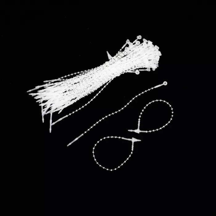 Clear plastic security ties, beaded. Adjustable and tamper-proof, our loop ties are easy to use on your merchandise tags and do not require a fastening gun.