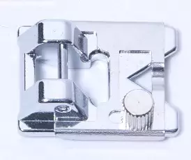 Braiding foot for perfect placement of cords, ribbon,braiding or tape up to 5mm in width. Adjustable guide to accommodate varying thread dimensions. Centers threads as they are stitched in place. For all 5 mm feed dog machines. Braiding foot attaches up to 3/16" width decorative trims.