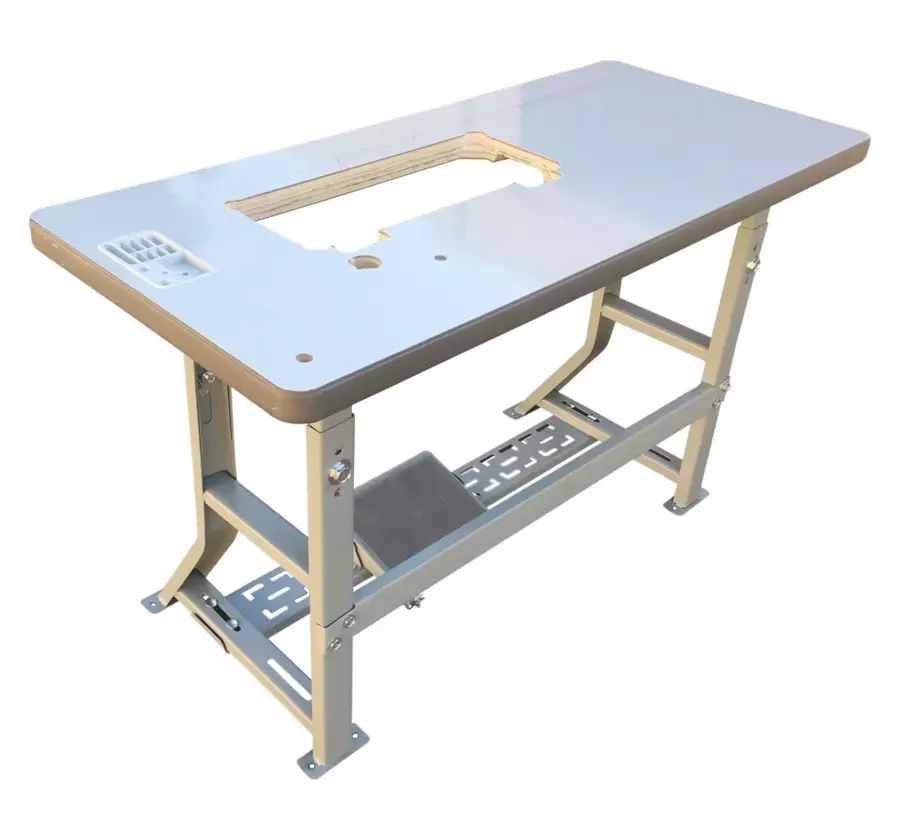 Industrial sewing machine table and stand (motor NOT included) for New-tech, JUKI, Concew, Singer, Brother, Artisan, Tacsew, Gemsy, Chandler, Yamata, and other similar industrial sewing machines that use oil pans and have rounded cushion cut outs on front side corners. Assembly required.